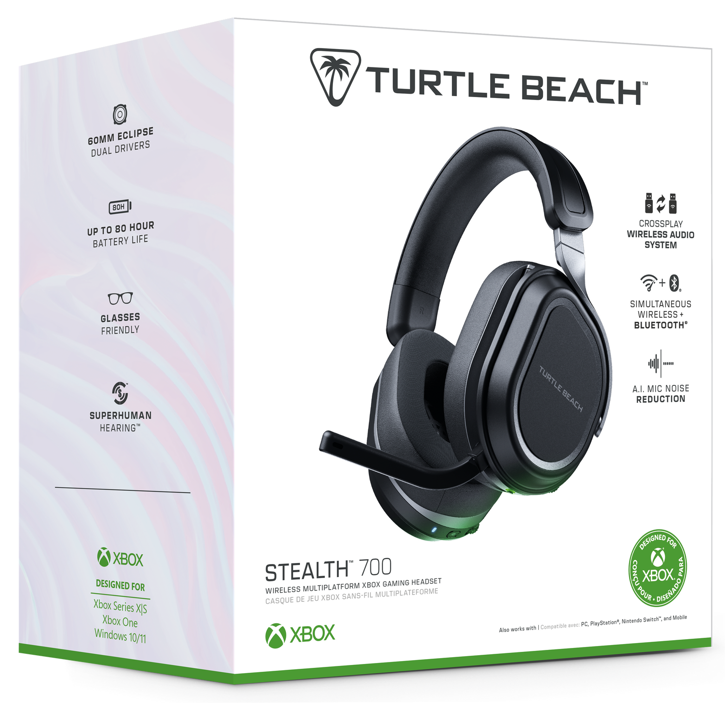 The Turtle Beach® Stealth™ 700 wireless multiplatform gaming headset for Xbox®, PlayStation®, PC, Steam Deck™ and mobile is redesigned for a 3rd generation of premium gaming prowess. The all-new CrossPlay wireless system with dual USB transmitters and simultaneous Bluetooth® connectivity delivers quick and easy connection to gaming consoles, PC & mobile devices. Huge, 60mm Eclipse™ Dual Drivers deliver unparalleled audio quality, and the Gen 3, flip-to-mute mic with A.I. noise cancellation allows for exceptionally clear voice accuracy. Plus, using the Swarm™ II companion app, you can adjust your microphone & audio settings to your exact, customized preference. Dominate for hours in complete comfort with a best-in-class 80-hour battery life, and memory foam ear cushions.